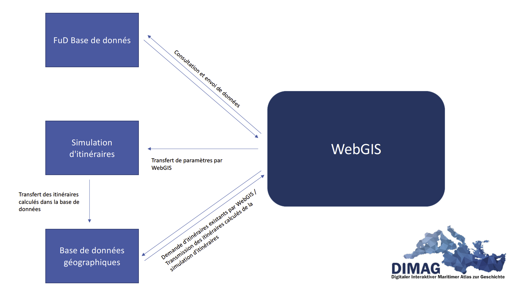 Pour la mise à disposition des données, DIMAG utilise deux bases de données différentes, qui sont hébergées avec le reste de l’architecture DIMAG sur le même environnement serveur. On peut distinguer la base de données de recherche FuD, dans laquelle sont surtout mises à disposition des données géoréférencées issues du domaine de projet de la recherche historique, ainsi qu’une base de données géographiques, dans laquelle sont enregistrées les simulations de routine.